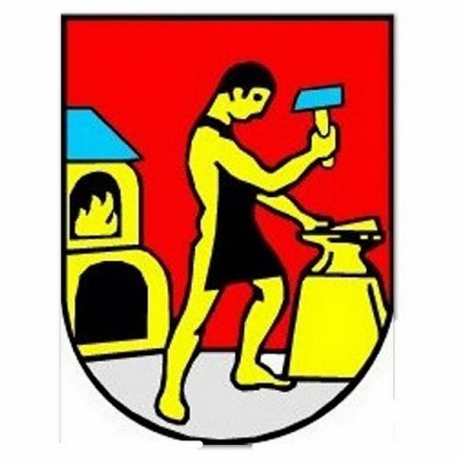 V červeném štítě na stříbrném trávníku doleva obrácený zlatý kovář s černými vlasy a.