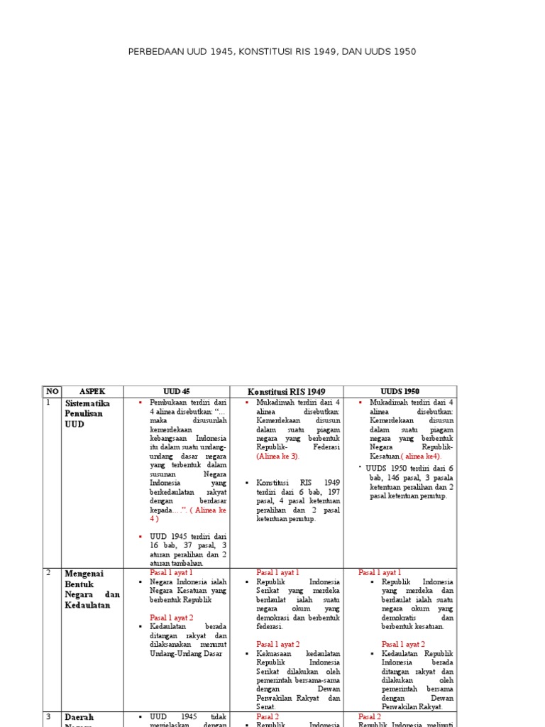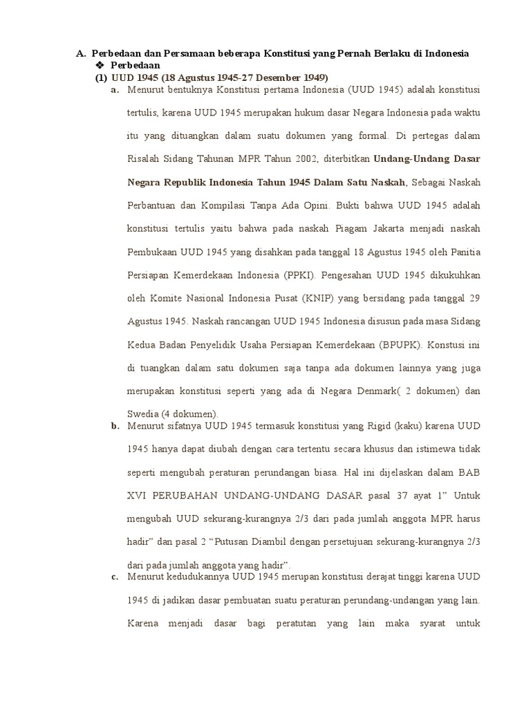 Perubahan uud 1945 kemudian dilakukan secara bertahap dan menjadi salah satu agenda sidang tahunan mpr dari tahun 1999 hingga perubahan ke empat pada sidang tahunan mpr tahun 2002 bersamaan dengan kesepakatan dibentuknya komisi konstitusi yang bertugas melakukan pengkajian. Kemerdekaan disusun dalam suatu piagam negara mungkin di antara kita ada yang ingin mengetahui perbedaan antara uud 1945 , konstitusi ris 1949 dan uuds 1950 ber. Perbandingan uud 1945, konstitusi ris 1949. Tahukan kamu apa arti konstitusi? Uud 1945 dalam prosesnya tidak bersifat absolut, maksudnya uud 1945 dapat diamandemen sesuai dengan keadaan dan kebutuhan negara indonesia. Setiap negara memiliki konstitusi yang berbeda, baik konstitusi di indonesia sekalipun. Apa perbedaan konstitusi dan uud? Uud 1945 sebagai konstitusi di indonesia yang selama ini disakralkan dan tidak boleh diubah, kini telah mengalami beberapa perubahan. Format kelembagaan negara dan pergeseran kekuasaan dalam uud 1945. Uud memiliki sifat mengikat oleh karenanya makin elastik sifatnya aturan itui makin baik, konstitusi menyangkut cara suatu pemerintahan diselenggarakan. Konstitusi adalah hukum dasar tertulis dan tidak ter tulis sedangkan uud adalah hukum dasar tertulis. Jadi pancasila adalah jiwa, sumber dan landasan uud 1945. Konstitusi yang berlaku di indonesia saat ini adalah uud 1945 yang dibentuk sejak indonesia sukses memproklamasikan kemerdakaannya.